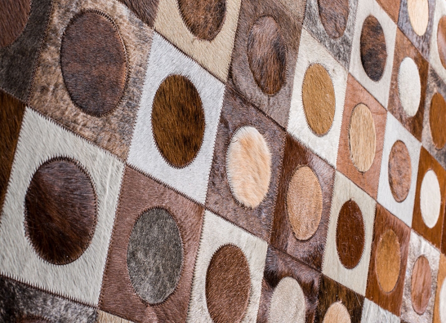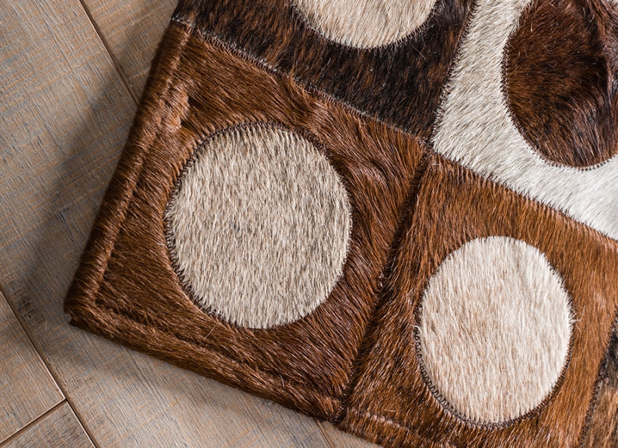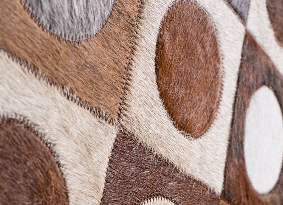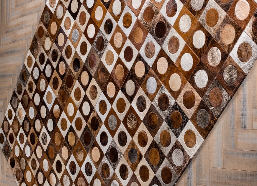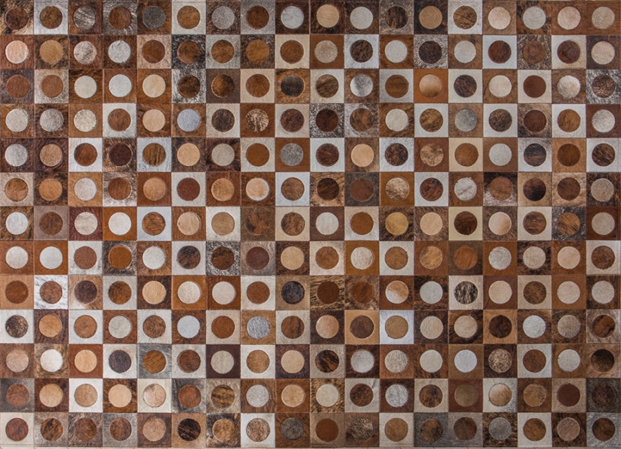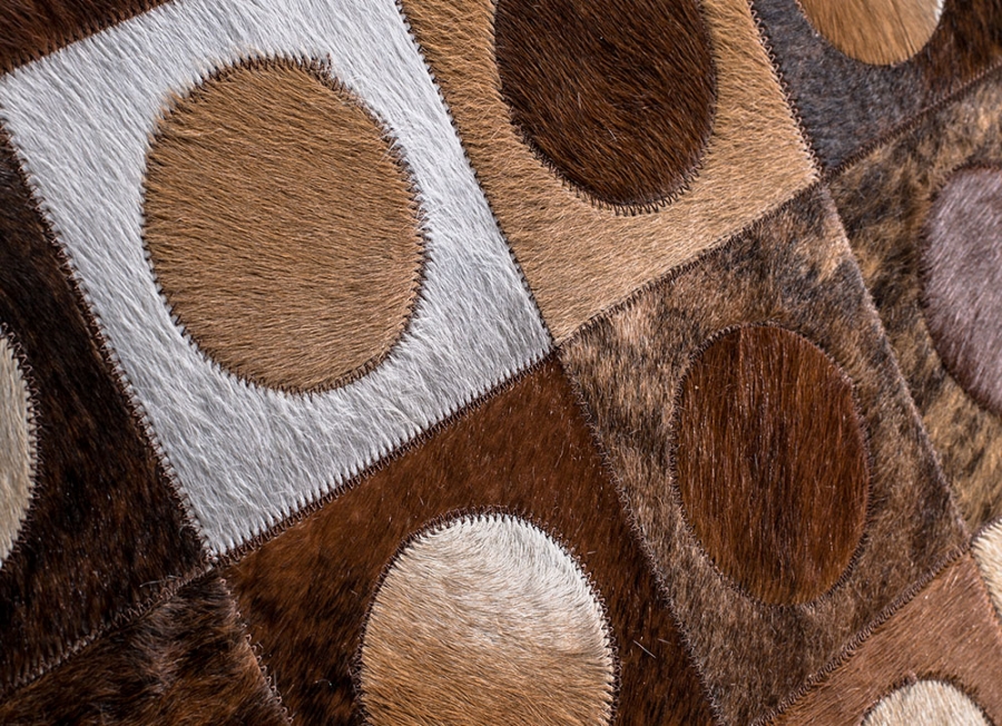 Kombinacija različitih nijansi braon, bež i bele boje raspoređenih u geometrijski raspored krugova i kvadrata stvara moderan dezen i teksturu ali u klasičnim bojama, te omogućava uklapanje ovog tepiha i u moderne i u klasične enterijere.