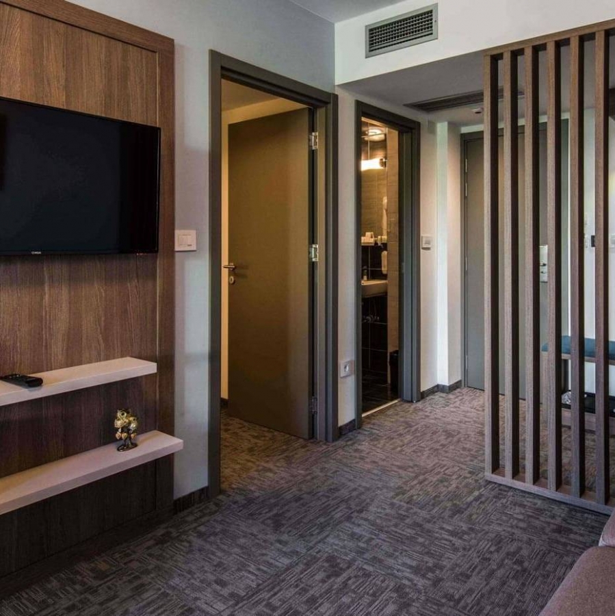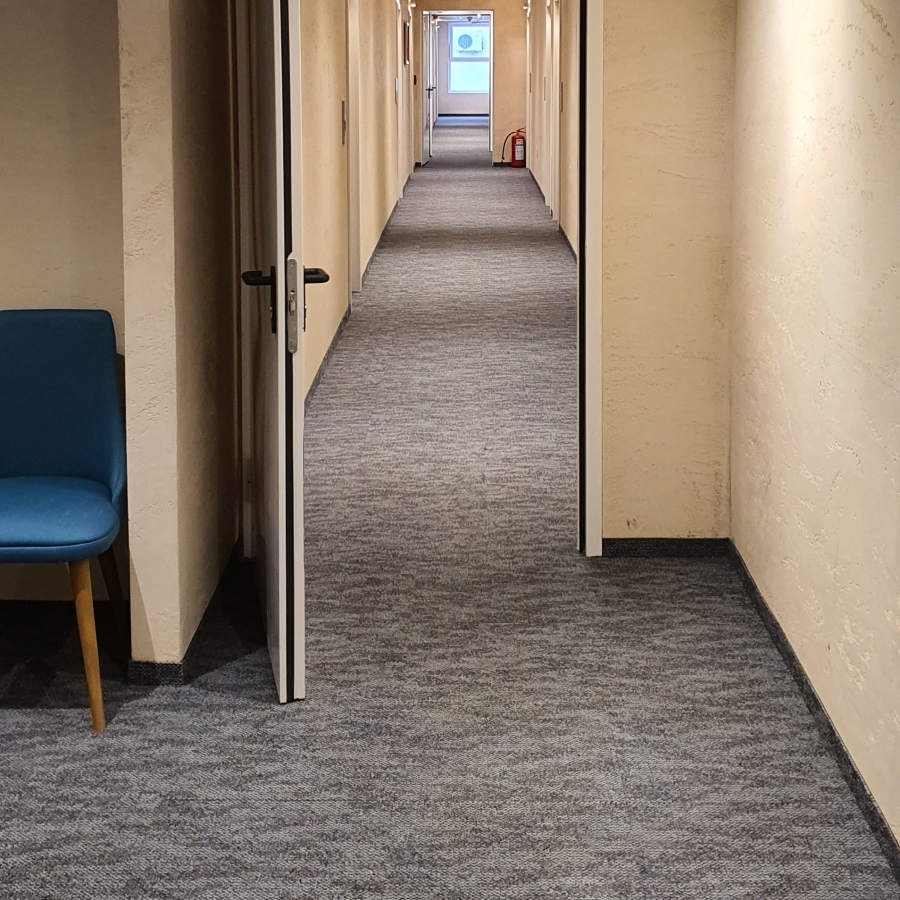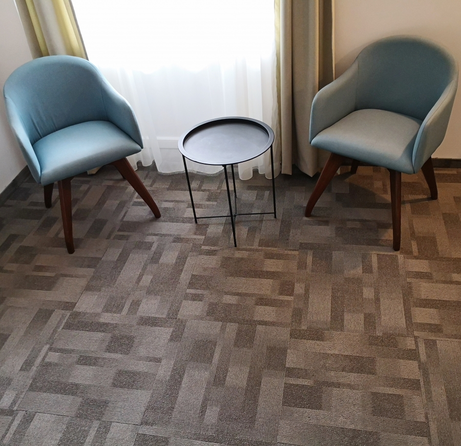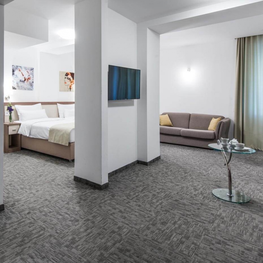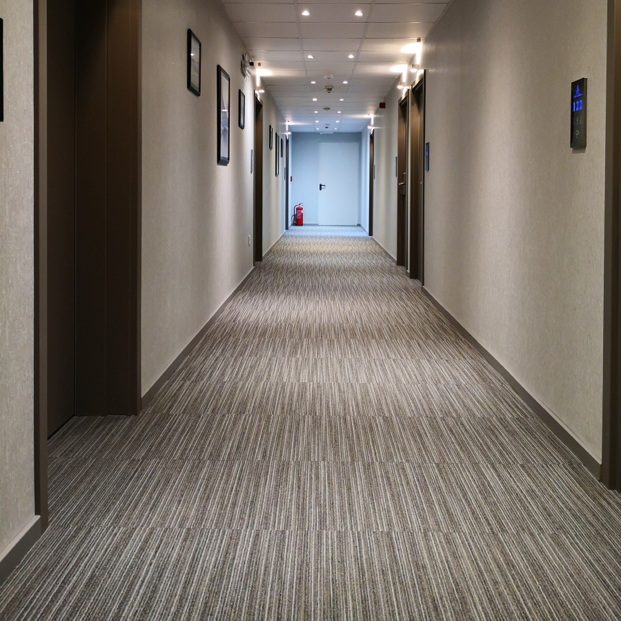 Kao pravo rešenje koje može da odgovori na sve postavljene zahteve Investitora je odabrana kombinacija tepisona u pločama iz naše ponude. Data kombinacija proizvoda sa različitim upotrebnim vrednostima i cenama je omogućila i dovoljno luksuza za dobijanje 4 zvezdice, i kreativnu kombinaciju dezena u različitim delovima hotela gde su mekši tepisoni postavljeni u sobe i apartmane radi udobnosti gostiju a izdržljiviji u kongresne sale, stepeništa i hodnike, i cenovno prihvatljivo rešenje za Investitora uz praktično i lako održavanje tokom eksploatacije i laku zamenu poda prilikom eventualnog naknadnog renoviranja.