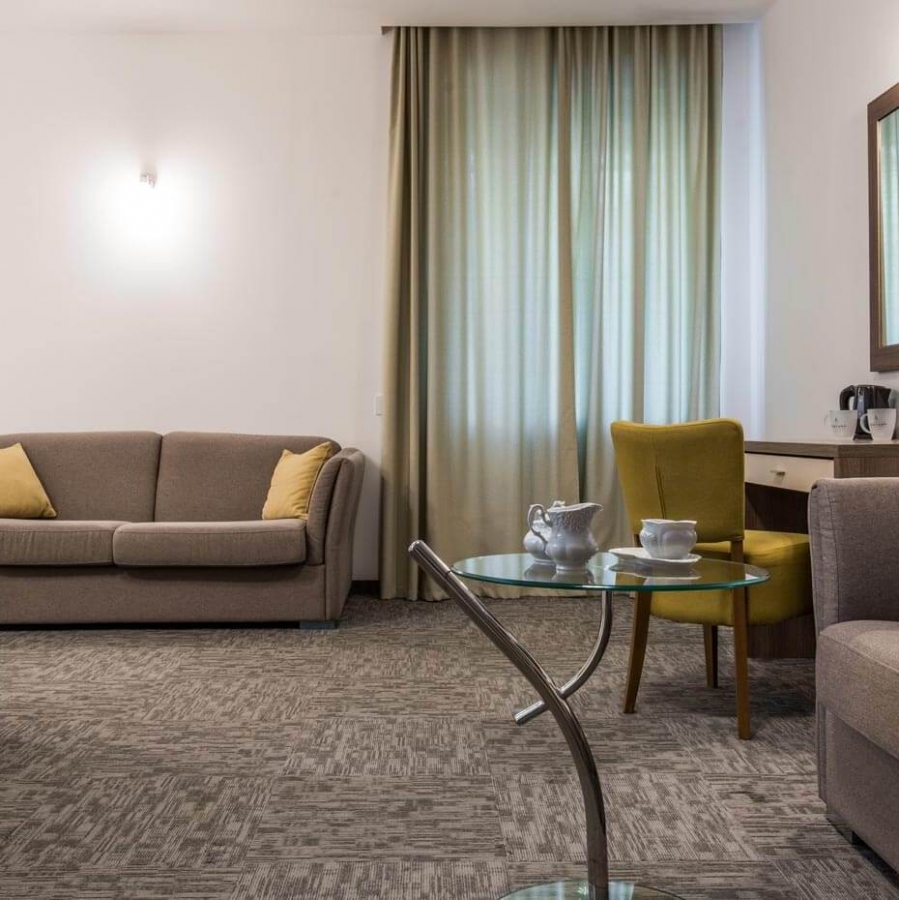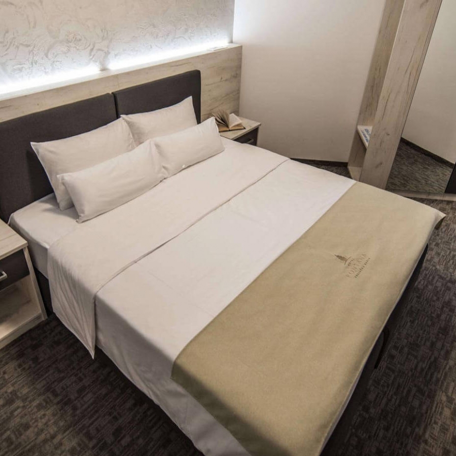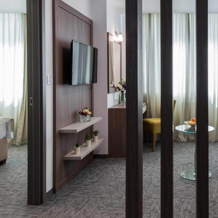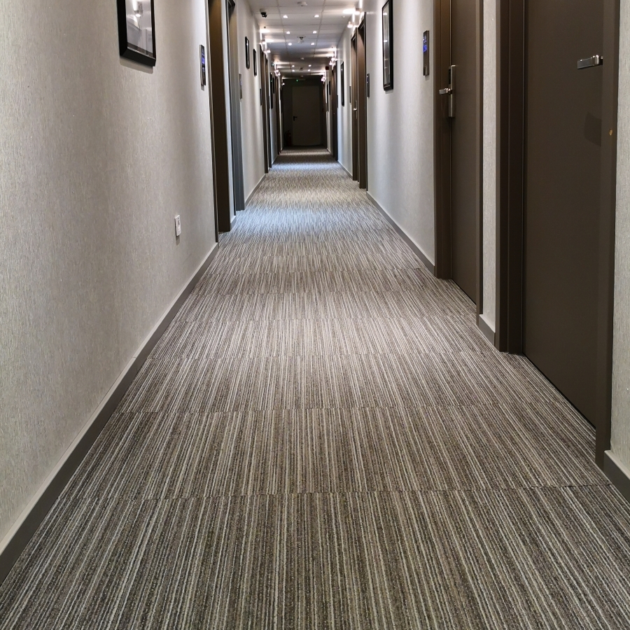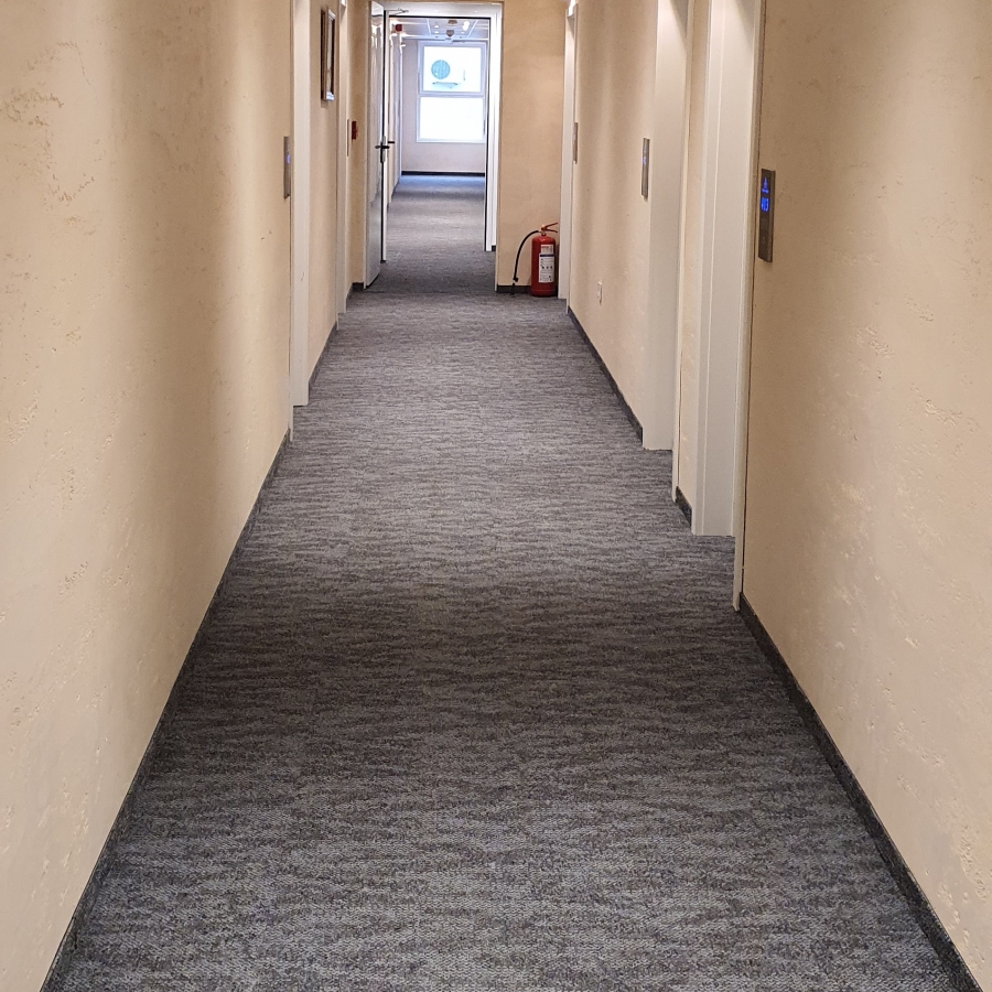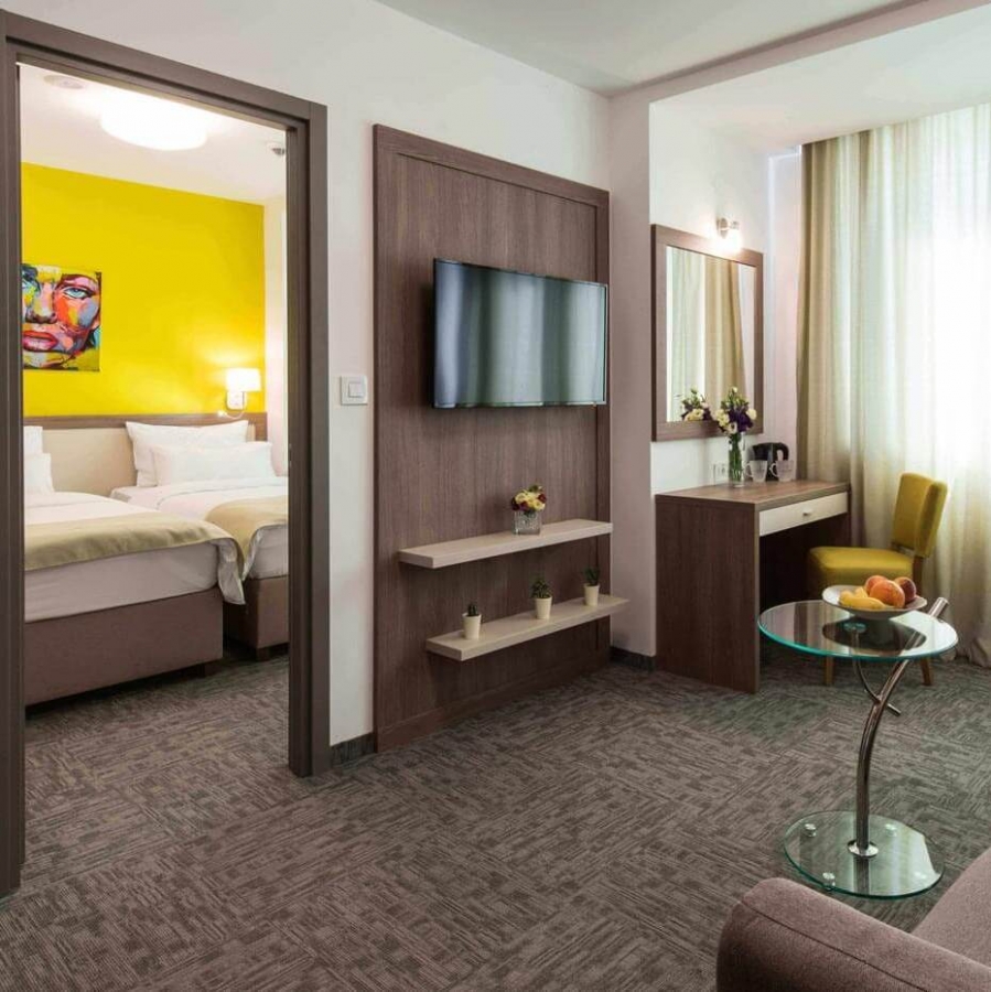 Kao pravo rešenje koje može da odgovori na sve postavljene zahteve Investitora je odabrana kombinacija tepisona u pločama iz naše ponude. Data kombinacija proizvoda sa različitim upotrebnim vrednostima i cenama je omogućila i dovoljno luksuza za dobijanje 4 zvezdice, i kreativnu kombinaciju dezena u različitim delovima hotela gde su mekši tepisoni postavljeni u sobe i apartmane radi udobnosti gostiju a izdržljiviji u kongresne sale, stepeništa i hodnike, i cenovno prihvatljivo rešenje za Investitora uz praktično i lako održavanje tokom eksploatacije i laku zamenu poda prilikom eventualnog naknadnog renoviranja.