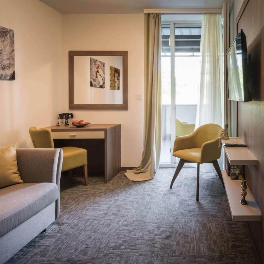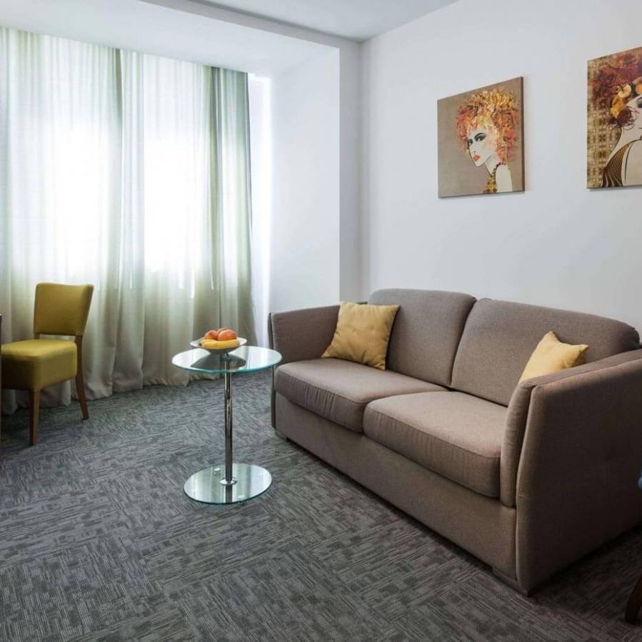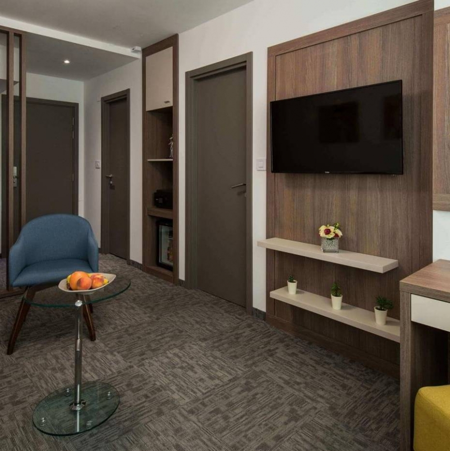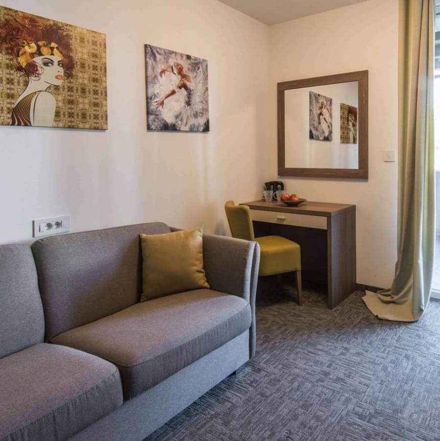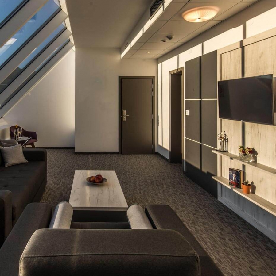 Kao pravo rešenje koje može da odgovori na sve postavljene zahteve Investitora je odabrana kombinacija tepisona u pločama iz naše ponude. Data kombinacija proizvoda sa različitim upotrebnim vrednostima i cenama je omogućila i dovoljno luksuza za dobijanje 4 zvezdice, i kreativnu kombinaciju dezena u različitim delovima hotela gde su mekši tepisoni postavljeni u sobe i apartmane radi udobnosti gostiju a izdržljiviji u kongresne sale, stepeništa i hodnike, i cenovno prihvatljivo rešenje za Investitora uz praktično i lako održavanje tokom eksploatacije i laku zamenu poda prilikom eventualnog naknadnog renoviranja.